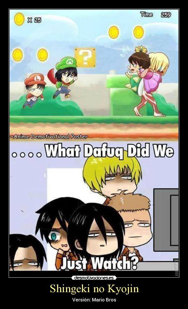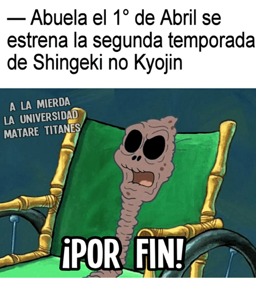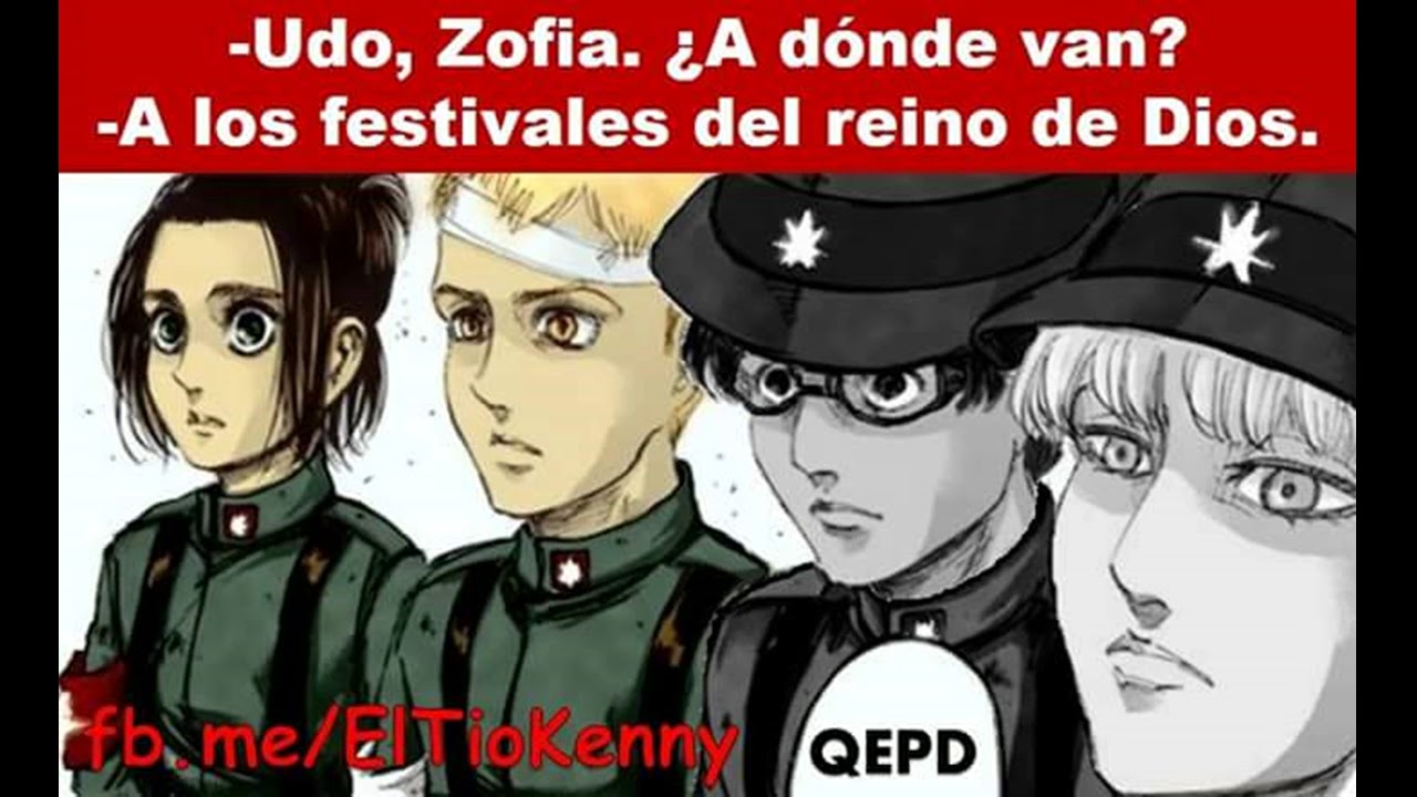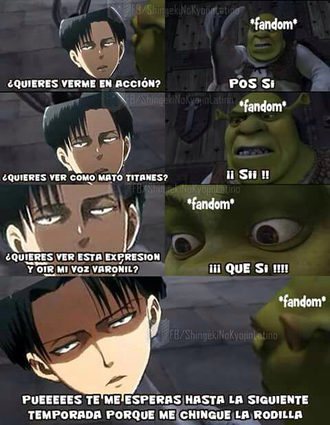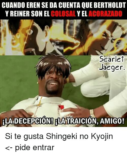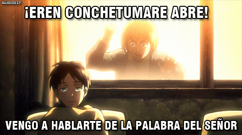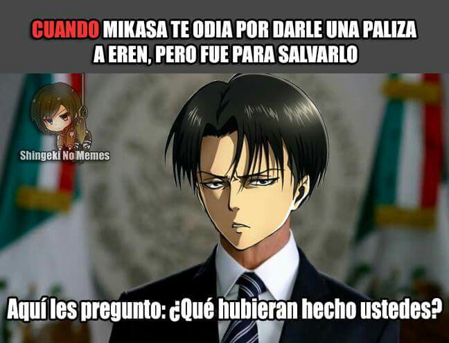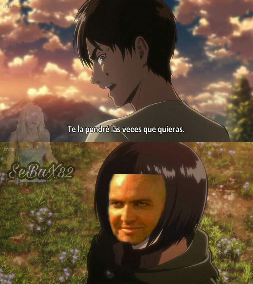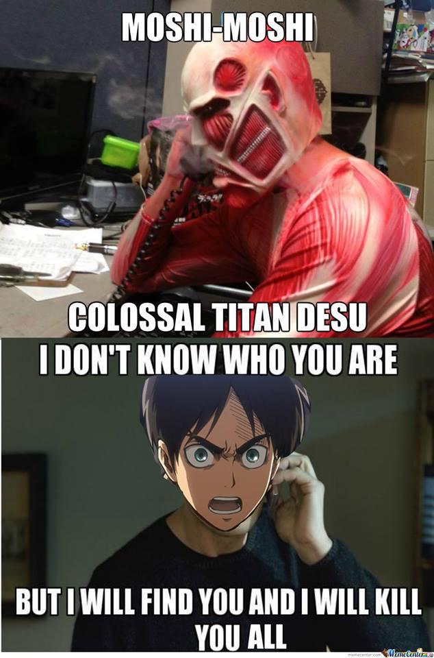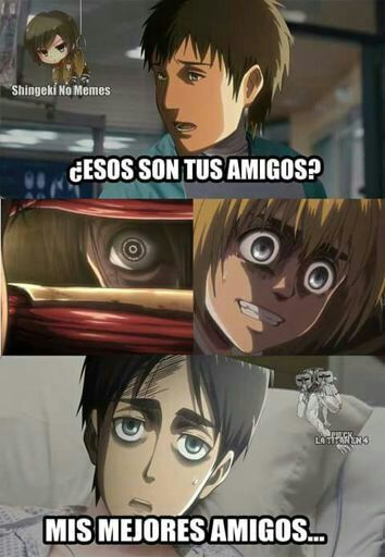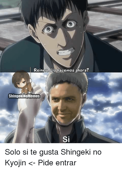 Sean bienvenidos a un nuevo artículo, En esta ocasión les traje una recopilación de lo que son memes de la popular serie “SHINGEKI NO KYOJIN”, los cuales te puede causar mucha gracia debido al tema que trata, Los memes que verán a continuación son de diversos personajes de la serie, no será un caso en el que solo se tratara de uno en particular. en esta recopilación de memes de shingeki no kyojin habrán más de 15 imágenes, las cuales estoy seguro de que te harán reír un montón, también podrán compartirlas entre tus amigos y familiares a los cuales les encanta el anime al igual que a ti y al resto de fans que conozca de esta serie para que ellos puedan pasar un momento chistoso con algunos de sus personajes preferidos de esta serie, estos memes de shingeki no kyojin están organizados aleatoria-mente, no vallan a pensar que están organizadas de alguna forma en especifico, no..También debo resaltar que estos memes poseen una buena resolución es decir que son HD, no son como las de otras recopilaciones en donde las imágenes se les puede apreciar una ligera distorsión en cada una de ellas, pues en estas no, de verdad se puede notar de lo que estoy hablando, y es algo el cual pueden ratificar o darse cuenta cuando estén observando los memes de shingeki no kyojin que les mostrare a continuación, a mí en lo personal me gustaron mucho de verdad están buenas y si me causaron mucha risa, y fue principalmente por eso que quise hacer este articulo para poder compartirlo y hacer que también ustedes logren pasar un buen rato con muchas risas.
