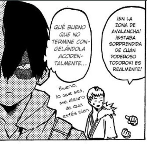 Recordamos que Shoto peleó con varios enemigos y se encontraba solo hasta que alguien le pregunta a Hagakure a dónde la enviaron debido a que nadie había logrado dar con ella, indicando que estaba junto a Todoroki, aunque él enseguida se sorprende, debido a que en ningún momento notó su presencia, indicando que era un alivio el no haberla congelado por accidente, sin embargo hay otro detalle.